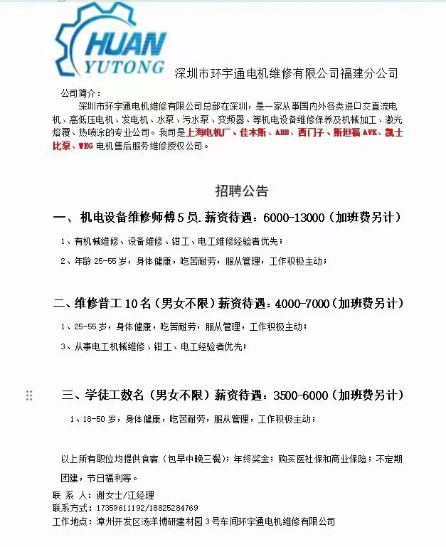 因公司发展需要,深圳市环宇通电机维修,招男女普工,电机维修学徒工,和机电水泵维修师傅,设备维修师傅···